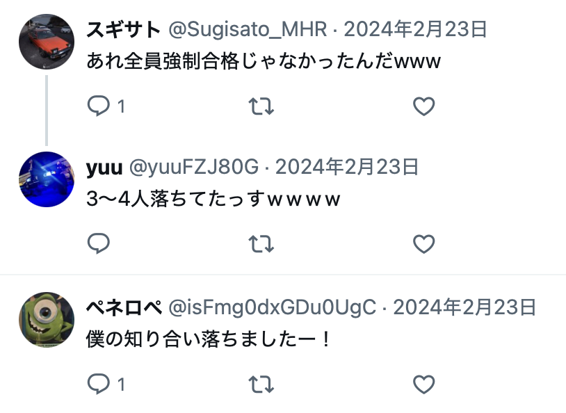 Xにて「3~4人落ちてたっす」のリプ・・・。