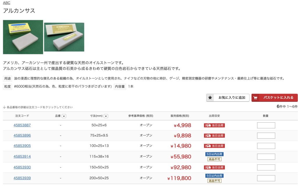 こちらはモノタロウのアルカンサス砥石の価格表です。(執筆時点での価格です)