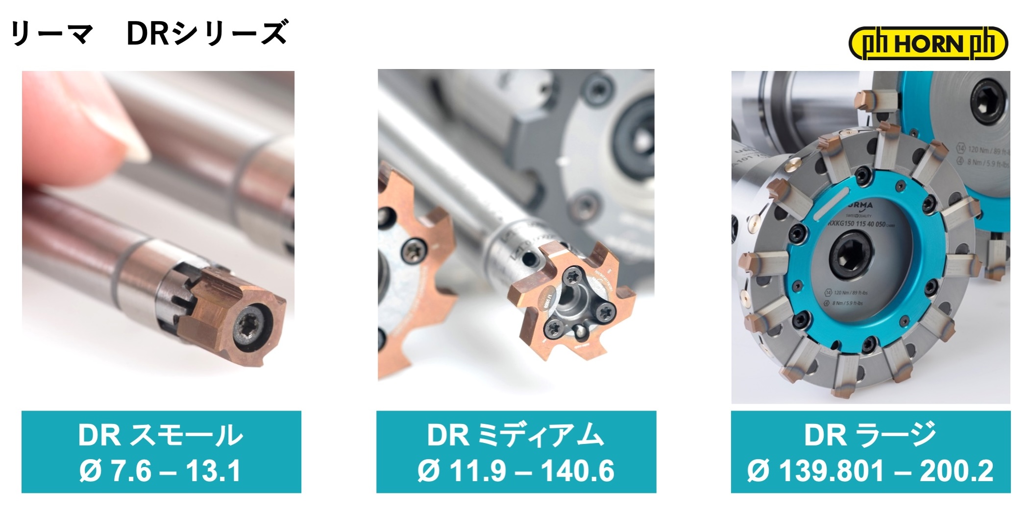HORNのリーマ、DRミディアム・ラージシリーズの径方向繰り返し精度は0.004mm以内、そしてDRスモールでも0.005mm以内を保証しています。一度ホルダで芯出しをしてしまえば、ヘッドを交換しても調整なしで即座に高精度な加工を再開できます。