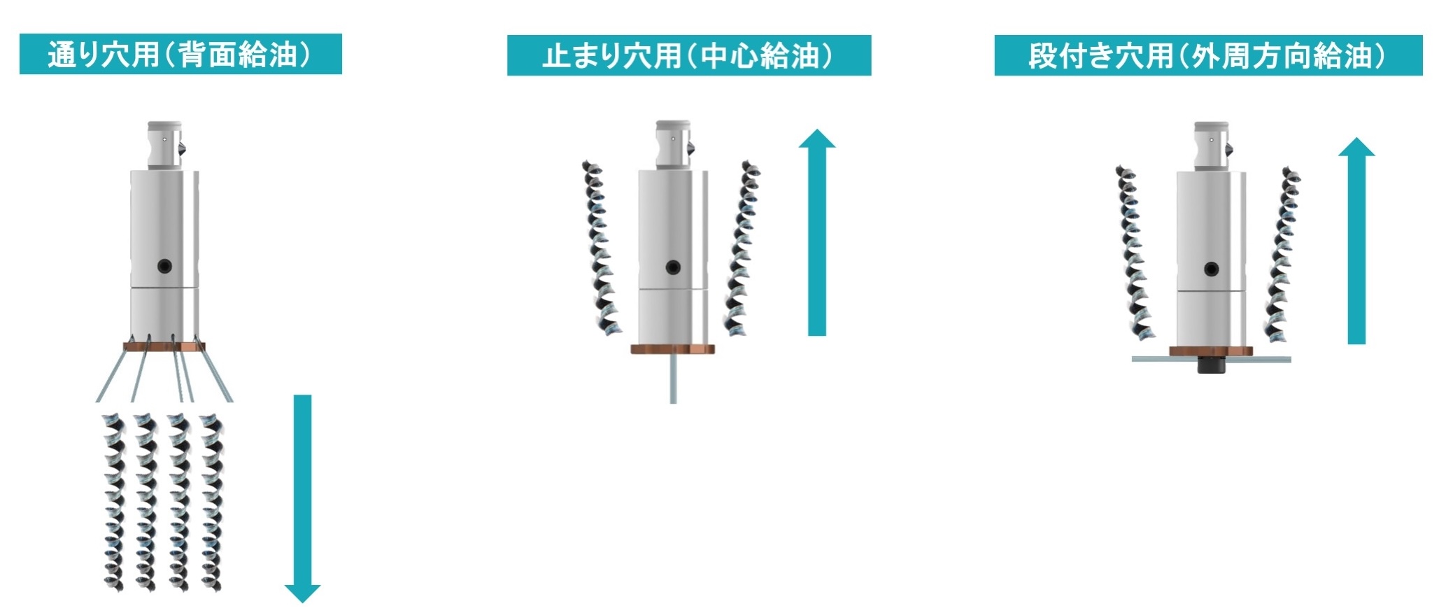 超硬ソリッドと比較しても、多様な給油方式を選択できるヘッド交換式は、給油面で大きく優位性があります。
